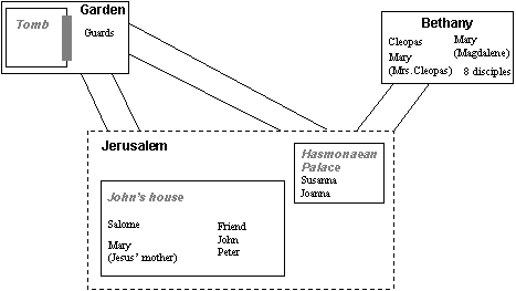 Cleopas remains at Johns house, whilst the two Marys, along with Salome, have called for Joanna and Susanna. The five women now head for the tomb to do the womens work of anointing the body. Meanwhile, the guards have recovered and are running back to tell the authorities of their experience. The angels are waiting inside the tomb. |