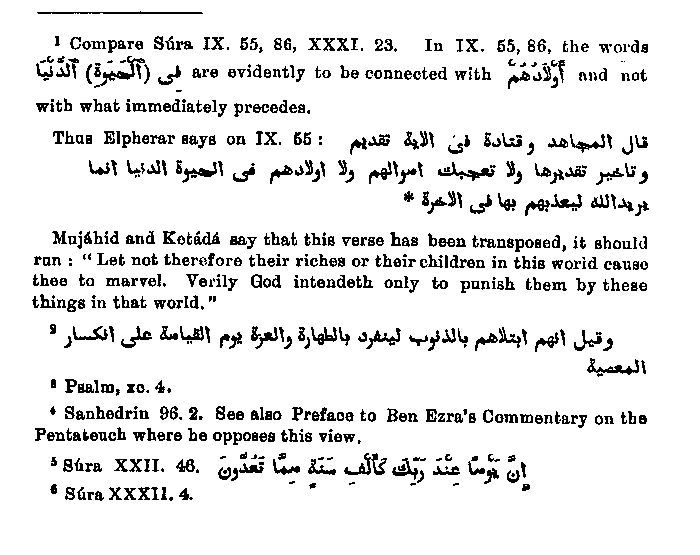 that their iniquity may be increased,"1 still the second view is to be found among the Arabians also, e.g., Elpherar in his comments on Quran XII. 42 2 says "It is said that the righteous are punished and tried, in order that the day of resurrection may be perfect in light and power, as the contumacy of the righteous has been already expiated." Muhammad naturally avoided specifying any time at which the judgment should take place, though he was much pressed to do so. He excused himself with the Jewish saying that with God a thousand years are as one day,3 which was divested of its poetic adornment and taken by the Rabbis in a purely literal sense.4 Muhamnad says:5 "Verily one day with thy Lord is as a thousand years of those which ye compute"; and again6 "On the day whose length shall be a thousand years of those which ye compute."