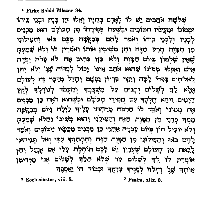 first." In Sunna 689 it is said "Three things follow the dead, but two of them turn back; his family, his goods, and his works follow him; his family and his goods forsake him again, and only his works remain with him." This is also found in great detail in Rabbinical Hebrew:1 "Man has three friends in his life time, - his family, his property, and his good works. At the time of his departure from earth he collects the members of his family, and says to them, 'I beg you, come and free me from this evil death.' They answer: 'Hast thou not heard2 that no one has power over the day of death.' It is also written:3 'None of them can by any means redeem his brother, even his
